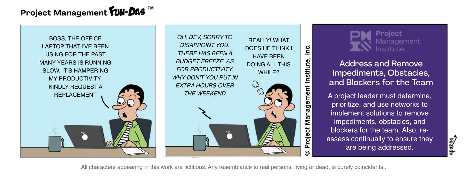 A weekly comic strip from PMI highlighting humorous situations and challenges in a project manager’s daily grind.