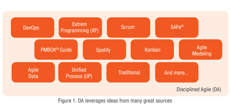 VICE PRESIDENT AND CHIEF SCIENTIST FOR DISCIPLINED AGILE, PMI One of the great things about agile and lean are that there are thousands of great practices and strategies (techniques) out there for you to choose from. Then again, one of the frustrating things about agile and lean are that there are thousands of great techniques to choose from. How do you find out about these techniques? When should you adopt a specific technique? When shouldn’t you? To what extent should you perform a technique? How do these techniques fit together? Answers to these questions are critical when a team is choosing its way of working (WoW). PMI’s Disciplined Agile (DA) toolkit has mined the various methods, frameworks, books of knowledge, and other sources to identify potential techniques that your teams may want to experiment with and adopt. We put these techniques into context, answering the questions mentioned above, and describe the trade-offs associated with each technique so that you can choose the right ones for your situation. Figure 1 indicates some of the methodologies and frameworks that we have mined for techniques.